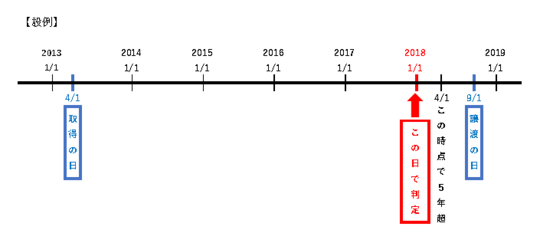 上の【設例】では、土地等・建物等の取得の日が2013年4月1日で譲渡の日が2018年9月1日です。単純な期間計算をしてしまうと、2018年4月1日で、所有期間は5年超と考えてしまいます。しかし、不動産譲渡所得の長期・短期の判定のための所有期間計算は、譲渡した年の1月1日までの期間を計算しますので、この【設例】では、2018年1月1日現在では所有期間は5年以下となります。